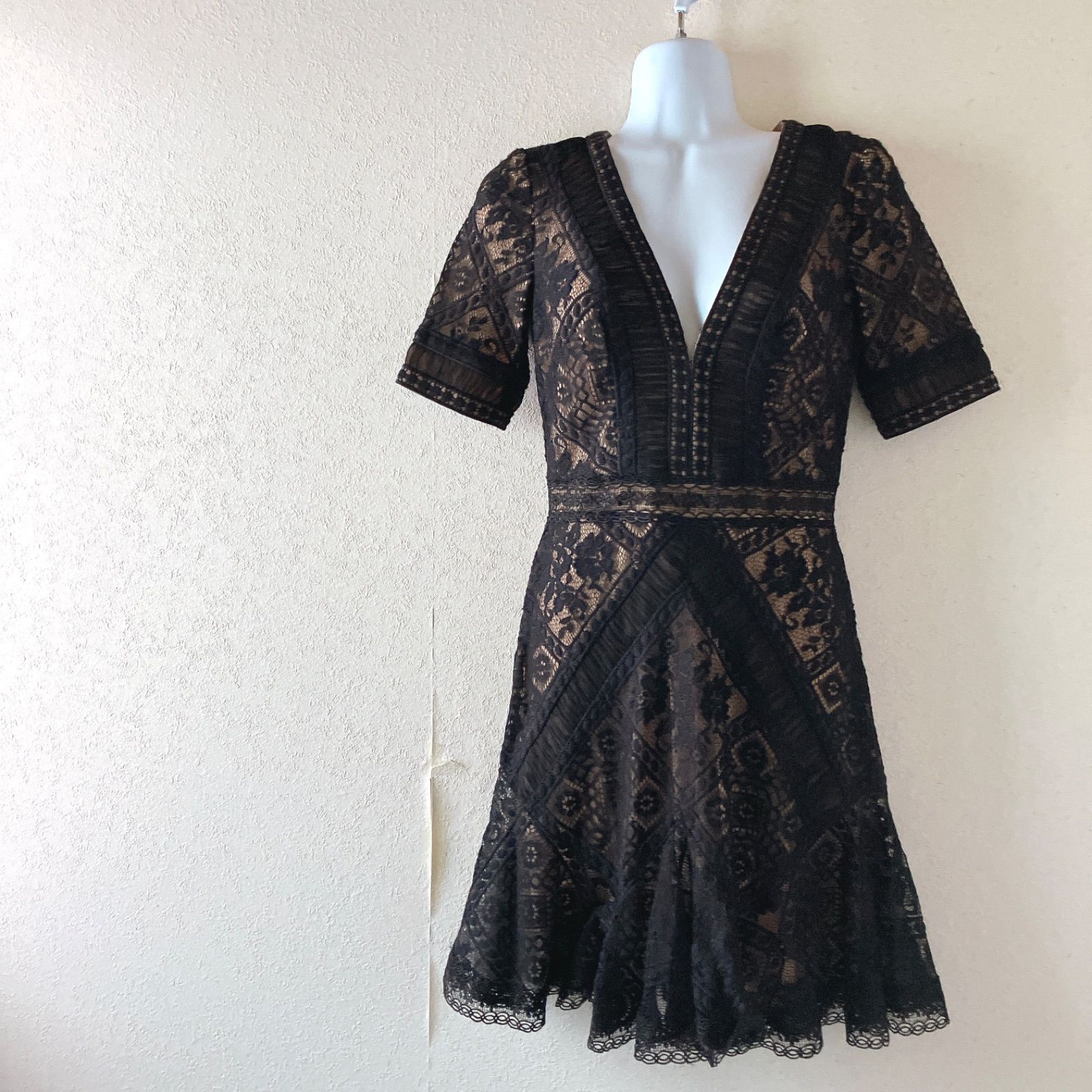 - レディース > ワンピース > タダシショージ 総レース ワンピース Vネック 切替 ノースリーブ ドレス TADASHI SHOJI】総レース Vネック フレアワンピース ブラック 黒 半袖