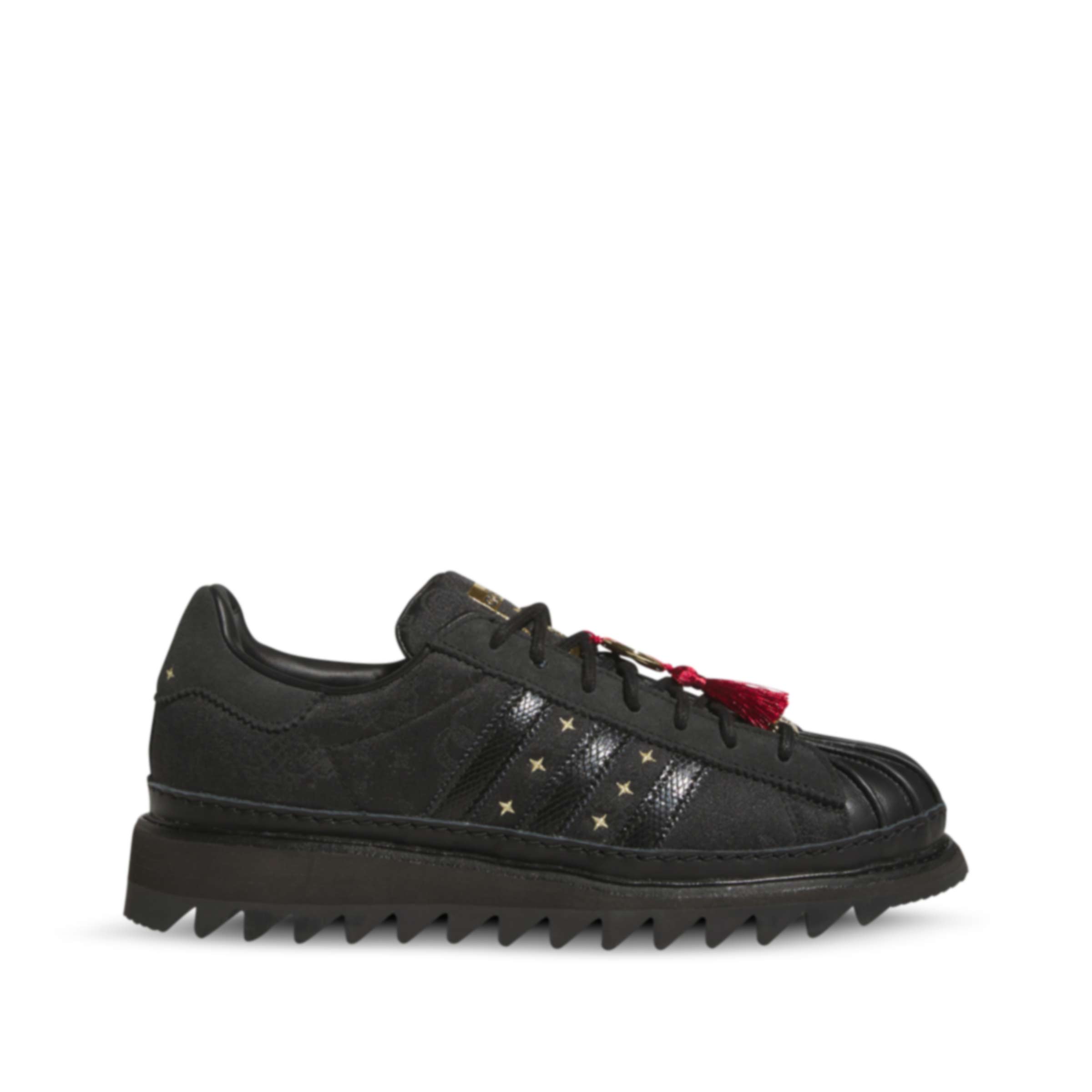 | 商品の特徴 | jr5114_blk_1.jpg。Celebrate Year of the Snake in Style: The CLOT x adidas LNY。Edison Chen's Next CLOT x Adidas Superstar 。CLOT x adidas Superstar “Lunar New Year” by Edison Chenクロット x アディダス スーパースター \"ルナ ニューイヤー\" バイ エディソン・チェンカラー: Black/Carbon/Gold llicスタイルコード: JR5114サイズ:27cm状態 : 新品未使用購入先:confirmed鮮やかな赤、エレガントなゴールドのアクセント、そしてアイコニックなシルクロワイヤルパターンで伝統とモダンを融合させたエディソン・チェンの“LNY CLOTコレクション”アディダスを象徴する1970年初登場のアイコンシューズ「スーパースター(SUPERSTAR)」をアレンジしたスニーカーは、アッパーにCLOTの柄パターンが落とし込まれ、レザーを巻いたシェルトゥや縁起のいいブラック/ゴールド/レッドのカラーリング、インソールに配された両ブランドロゴ刺繍の入ったタグが特徴的。adidas x Clot Superstar Sneaker (Core Black, Carbon & Gold Metal。#CLOT#ADIDAS#Superstar#LunarNewYear#LNY#ルナニューイヤー#アディダス#スーパースター#コラボ | ||